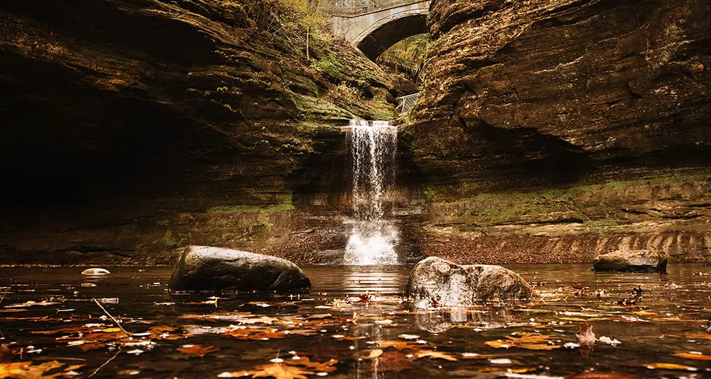 Situato a pochi chilometri da Starved Rock, Parco statale di Matthiessen offre viste sui colori autunnali altrettanto sorprendenti del suo vicino. Il parco ospita querce bianche e nere e cedri rossi che ricoprono il terreno accidentato di rossi e arancioni rugginosi. Il fiume Vermilion e le sue magnifiche scogliere che corrono lungo il bordo aggiungono un'altra dimensione di panorami pittoreschi.