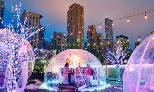 Festeggiate il Capodanno in grande stile con una vista mozzafiato su Chicago, ottima compagnia, bocconcini gourmet e cocktail artigianali sul tetto del Godfrey Hotel. Con 10.000 metri quadrati per festeggiare, prendete un biglietto d'ingresso generale o prenotate un tavolo o un igloo per il vostro gruppo!